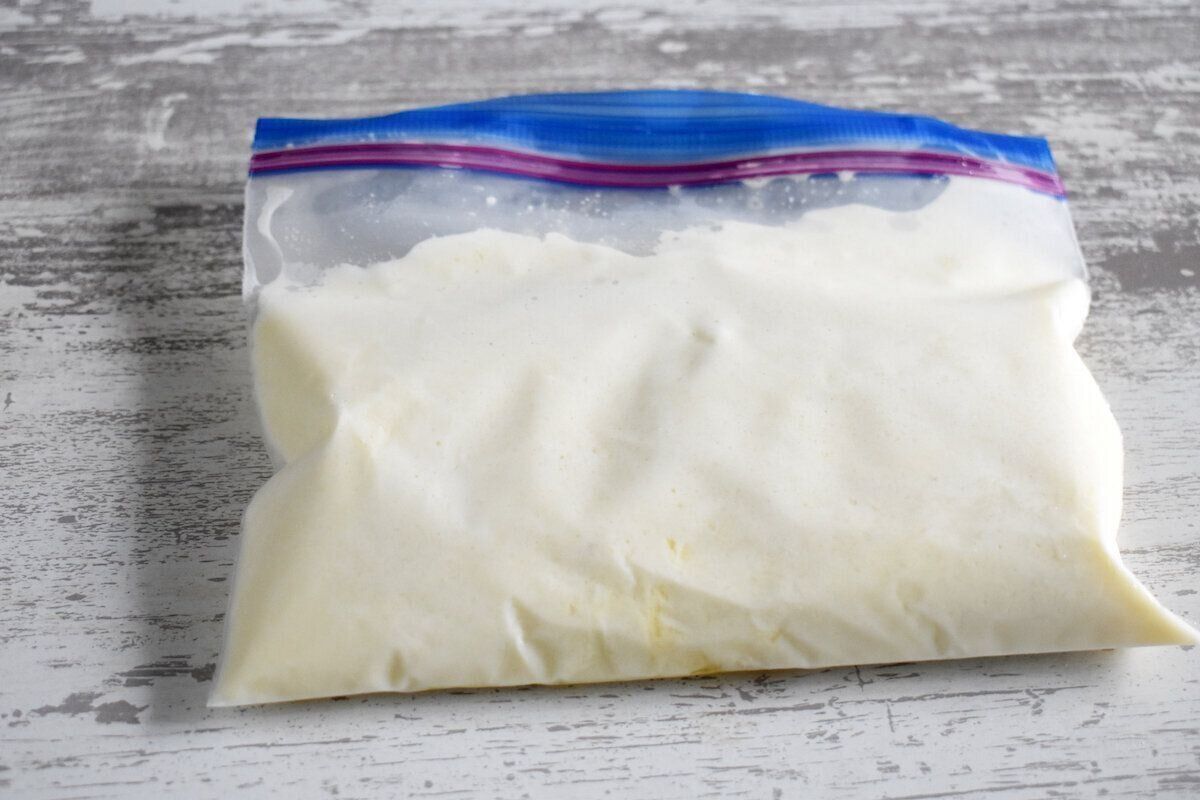 密閉袋(フリーザー用)に入れて冷凍保存すれば、バナナミルクのアイスに。ときどき、手でほぐしながら、徐々に冷やし固めるとほどよい食感になります。