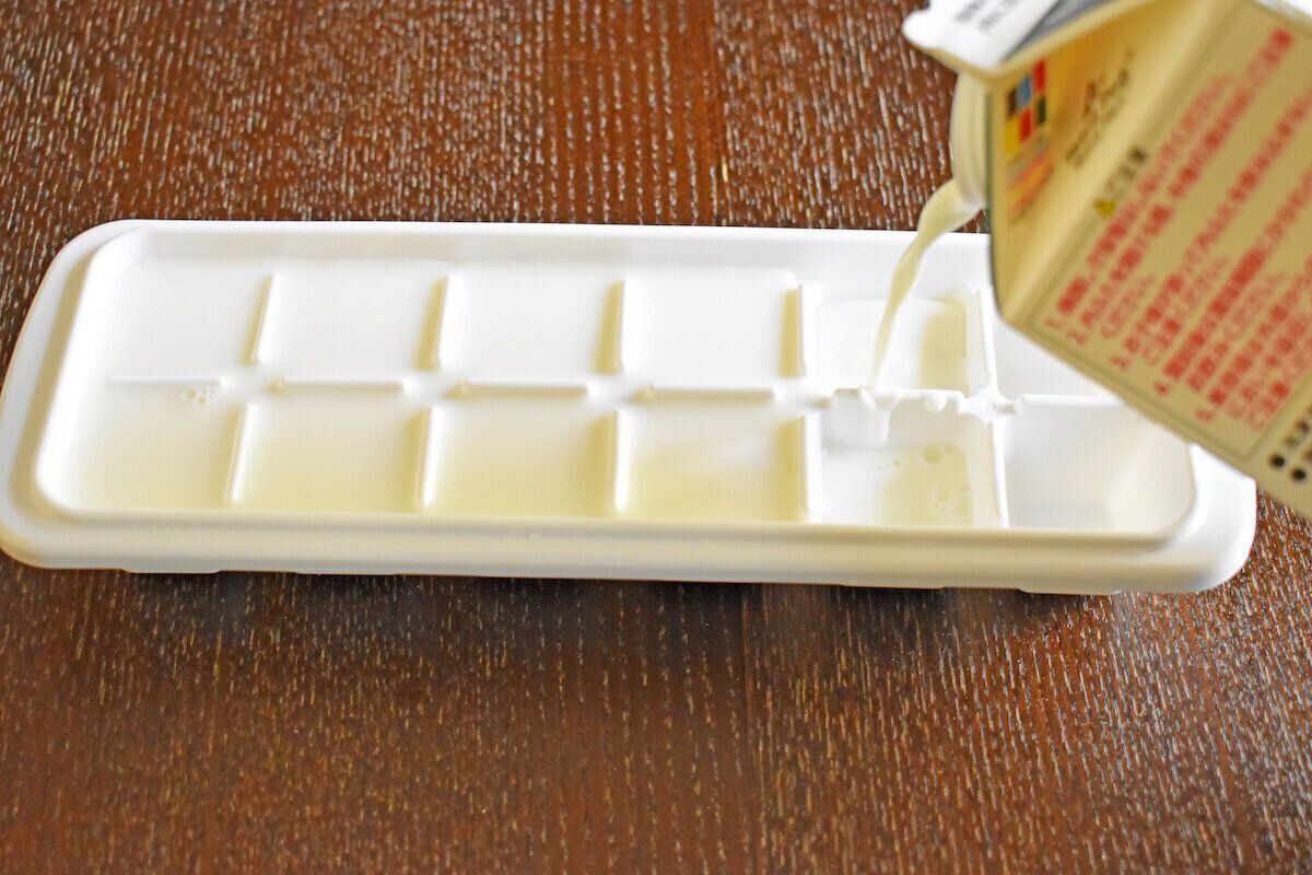 使う道具は製氷器。牛乳を均等に注ぎ凍らせます。