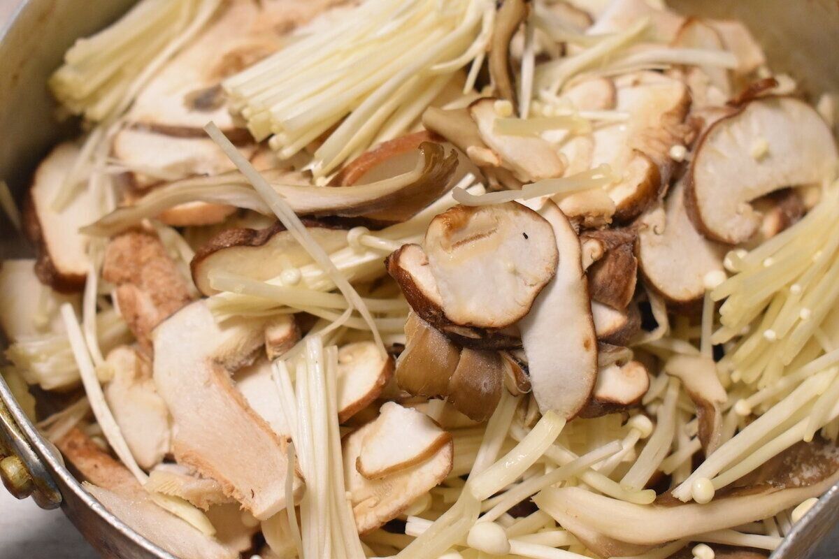 最初にざっくりお伝えすると、きのこ類は食べやすく切って、煮汁で煮るだけ。
