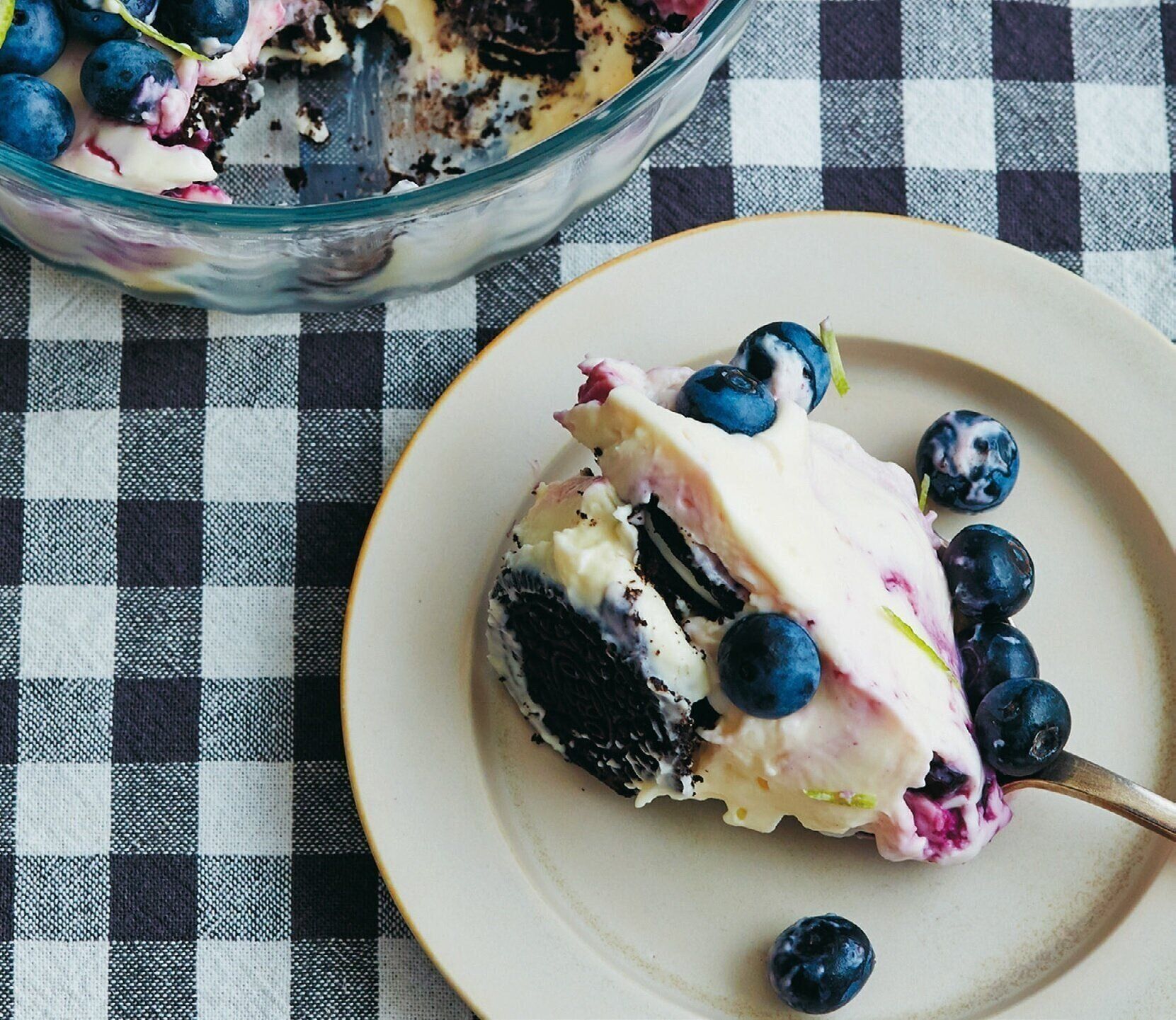 器にクッキー1/2量を敷き詰める。(1)のクリーム1/2量をのせて平らに広げ、残りのクッキーをのせる。残ったクリームにブルーベリージャムを加えてひと混ぜし、器に流し入れて平らに広げる。冷蔵室で約1時間冷やし、あればブルーベリーをのせ、レモンの皮(刻んだもの)を散らす。