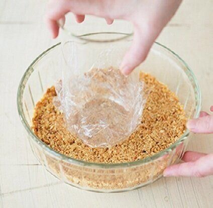 底が平らな容器にラップを掛け、ビスケット生地をしっかりと押しつける。
