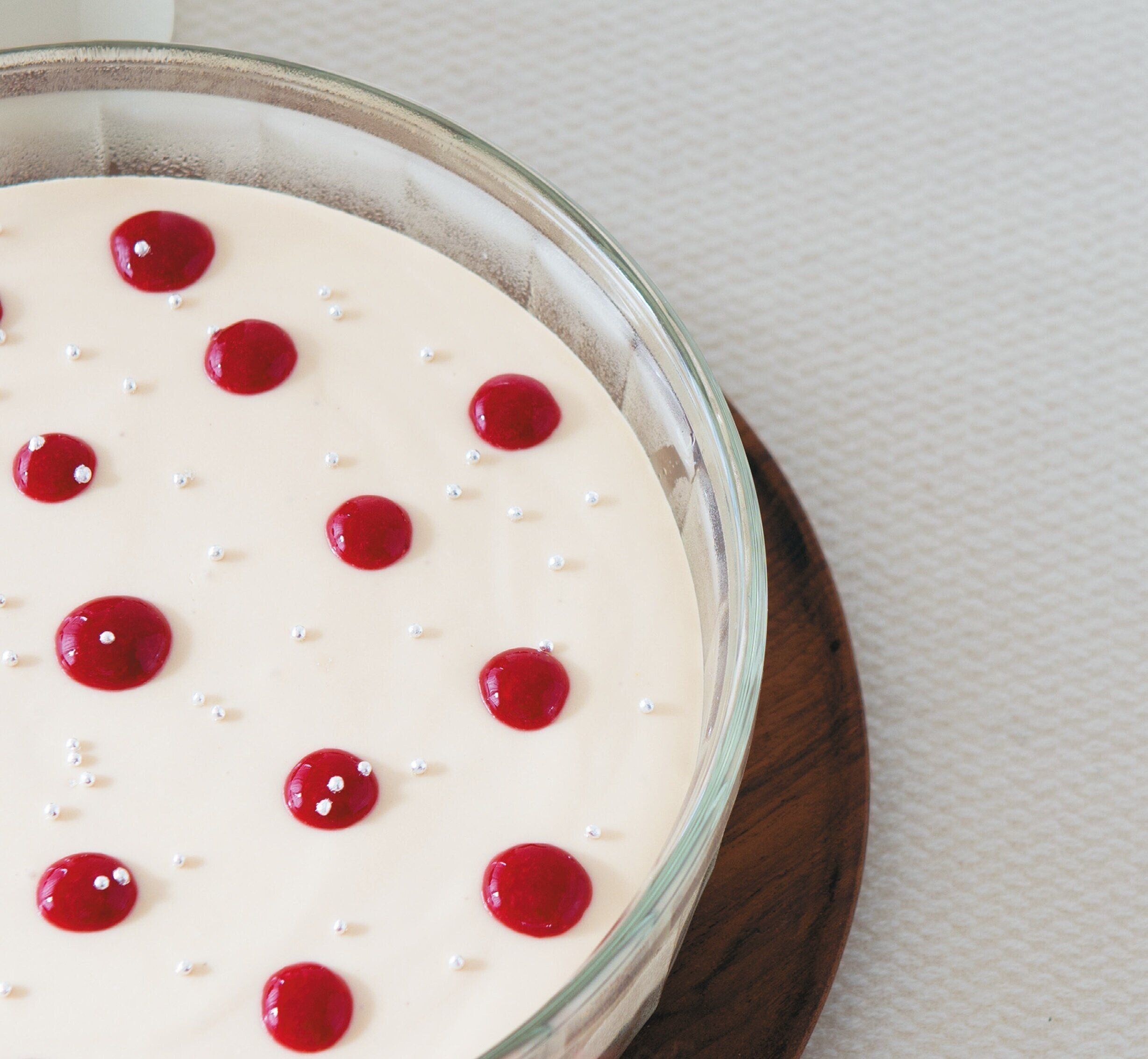 器に(1)のクリームを流し入れ、冷蔵室で2時間以上冷やす。いちごジャムを垂らして飾り、アラザンを散らす。