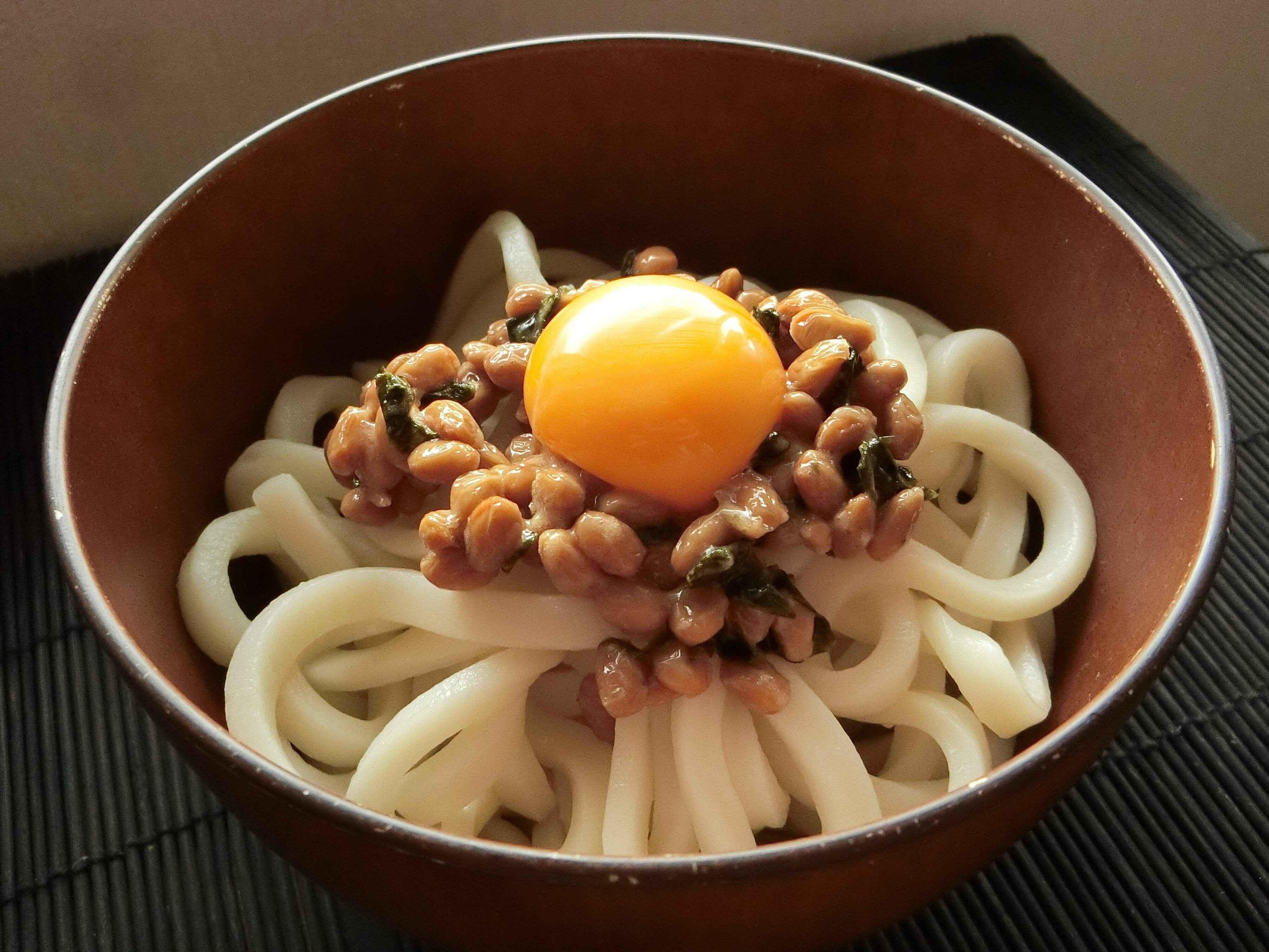 基本材料に納豆1/2パック、卵黄1個、海苔をトッピングし、つゆはめんつゆを使いました。納豆の添付のタレは納豆に海苔と一緒に混ぜ合わせます。食べるときにうどんと納豆、つゆをしっかり混ぜ合わせると味が均一になっておいしいです。