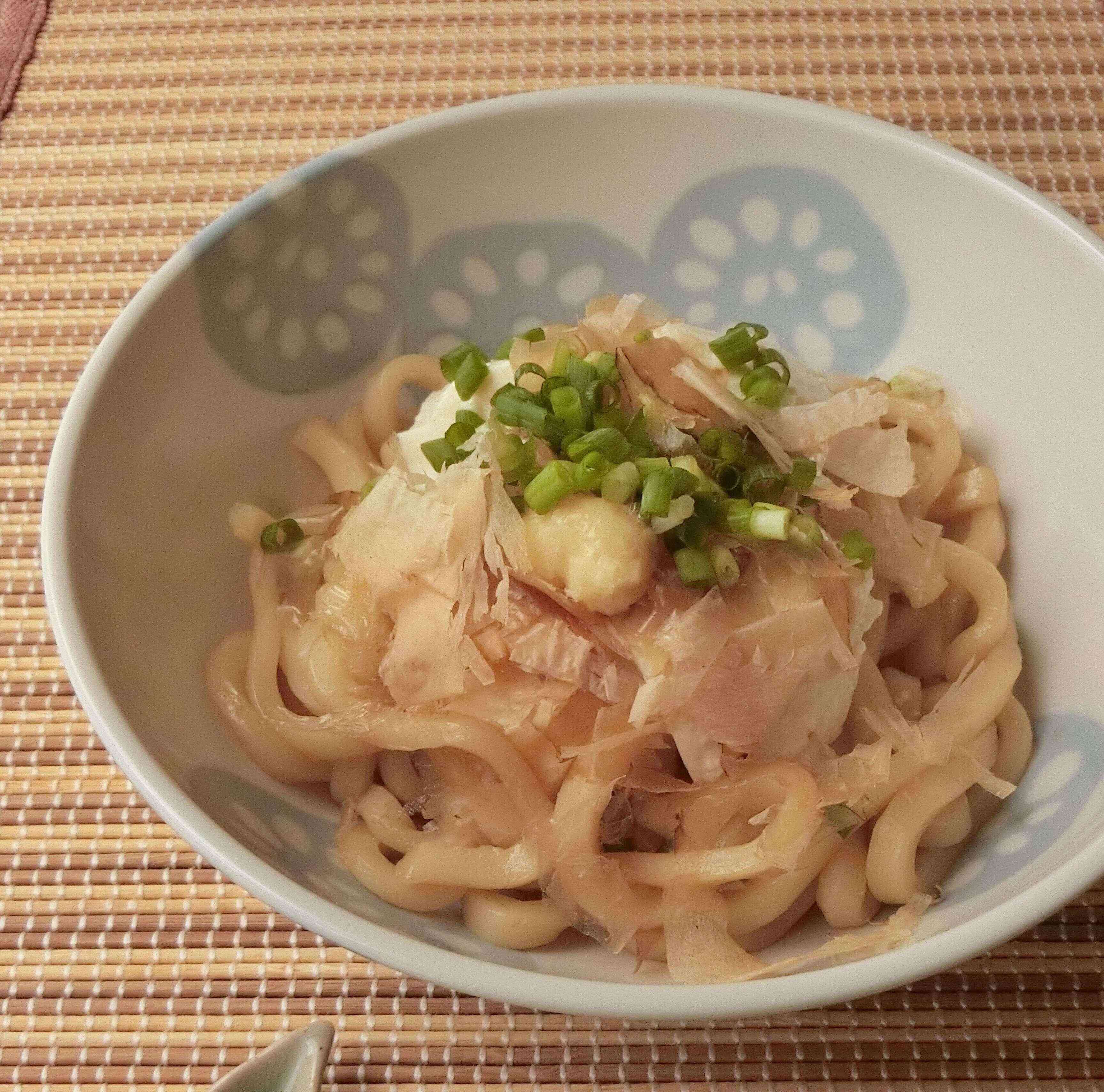 豆腐100gと鰹節、生姜や小葱をトッピングし、めんつゆを使った冷や奴うどん。豆腐はスプーンで崩しながら乗せ、鰹節とおろし生姜、キッチンばさみで切った小葱を乗せました。こちらも食べるときに混ぜ合わせればOK。