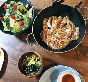市販の冷凍餃子を焼いて、サラダを作れば完成。冷凍餃子は少し残して、翌日にも使用。