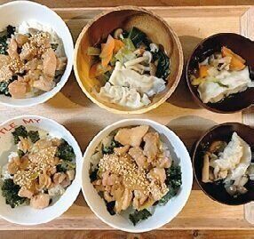 甘辛だれに漬けた鶏肉を焼き、ご飯にオン。昨日の餃子と冷凍野菜でスープを作れば10分!