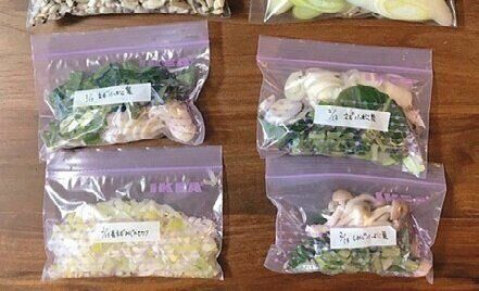 野菜を使うときは一気に刻んでしまい、余った物は冷凍に。数種類組み合わせれば、オリジナルミックス野菜が完成!新鮮なうちに冷凍すればおいしいし、汁ものを作るときなどに便利。