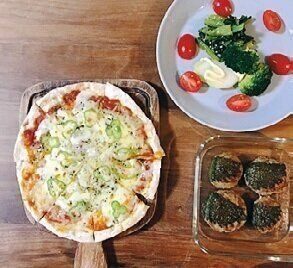 子どもがいる土日は時間がないので簡単に。市販のピザ生地に余っている野菜をのせるだけ。