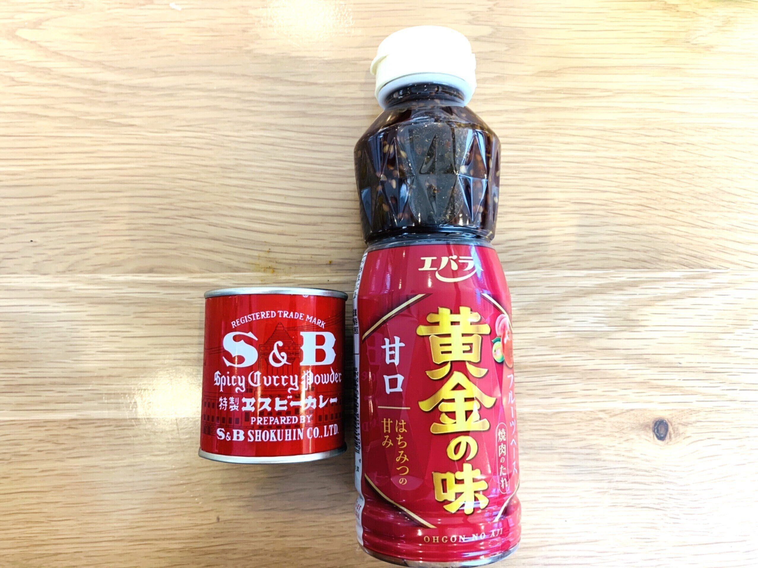 一番おススメの組み合わせが、こちら。焼き肉のタレ+カレー粉。我が家では黄金の味甘口を使っていますが、他のタレでもOKです。お肉や野菜を炒めたら、カレー粉を加えてよく炒め、香りが出たら仕上げにタレを加えて炒めたら完成。