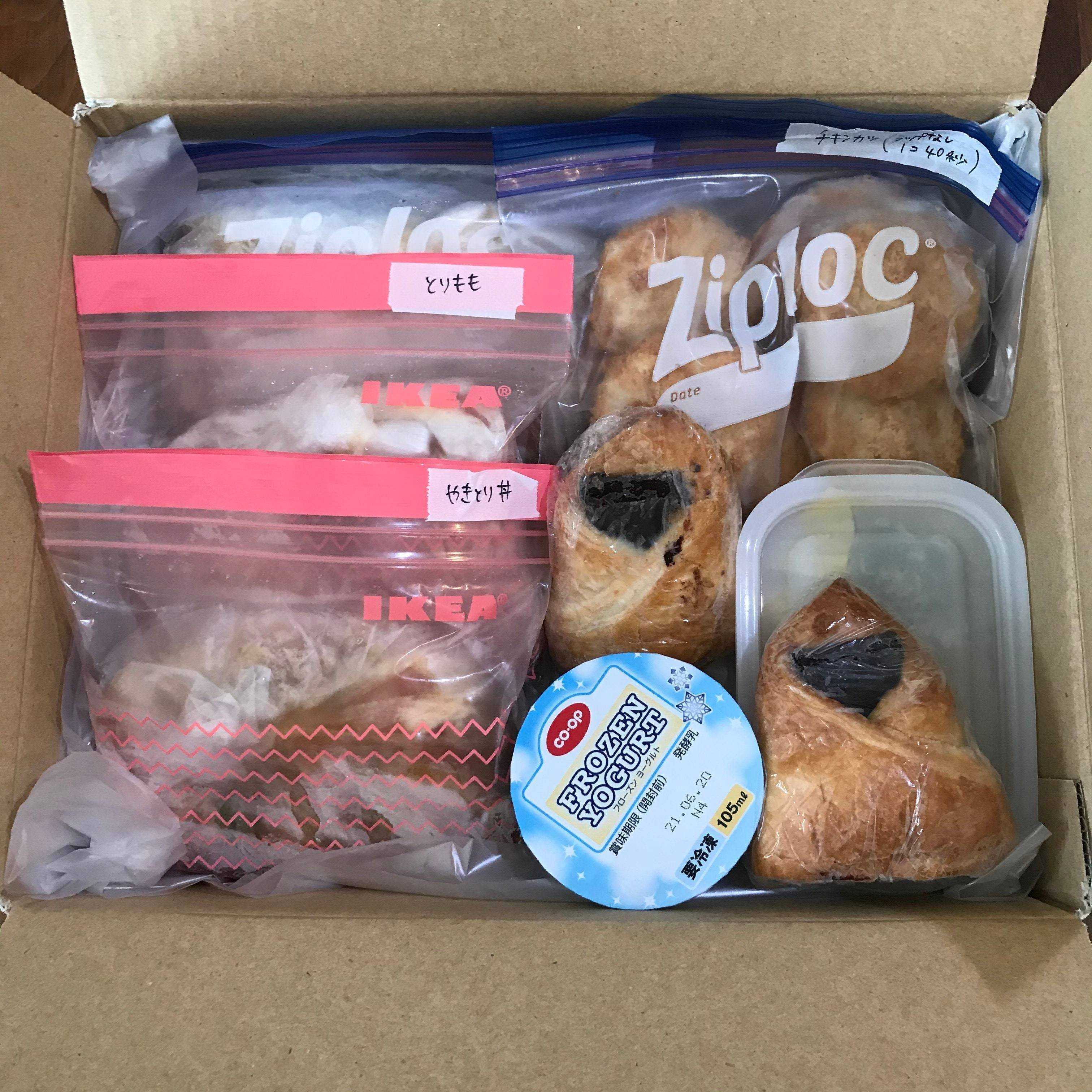 お弁当箱ゼロです。下味冷凍したお肉や市販の冷凍食品、パンなども入れています。箱も郵送会社規定のいちばん小さなサイズ。