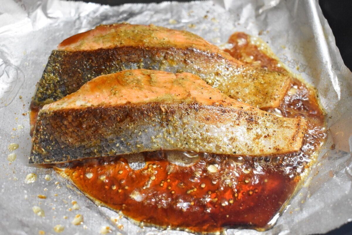 鮭にタレがからめます。動かすのは最小限にすることで、香ばしい焼き色がつきます。ただし焦げないように見張ってください!タレに濃度がつきトロッとなったらすぐに火を止め、ホイルで包む(またはフタをして)2分ほど蒸らし完成です。