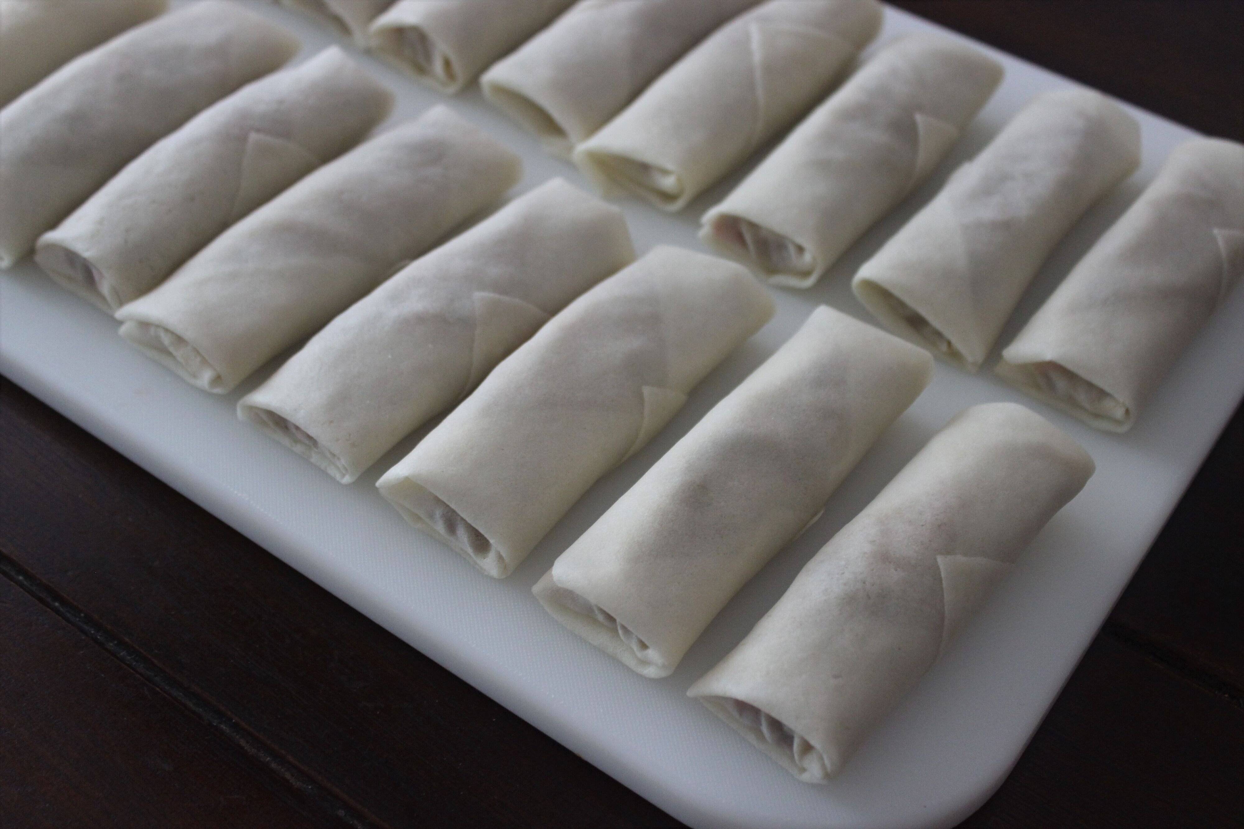 具が漏れると油はねや、他の春巻きが汚れる原因になるので皮はきっちり巻きます、