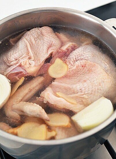 鍋に、胸肉、もも肉、手羽先を入れ、水8カップ(鶏肉が浸るくらい)を注ぎ、残りの材料を加えて火にかける。沸いたらアクを取り、中火にして10分ゆで、火を止めてそのままさます(暑いときは鍋を氷水で囲って冷やし、なるべく早くさます)。