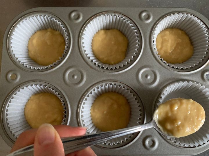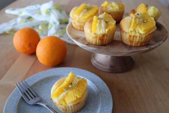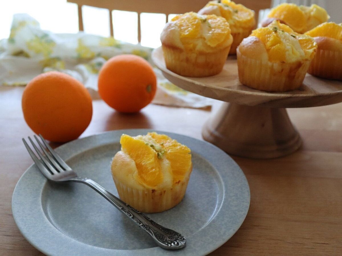 1.基本のマフィン生地をつくり、生地をひとすくいずつ型にながしたら、カスタードクリームを入れ、残りの生地を均等に入れてオレンジをのせて焼く