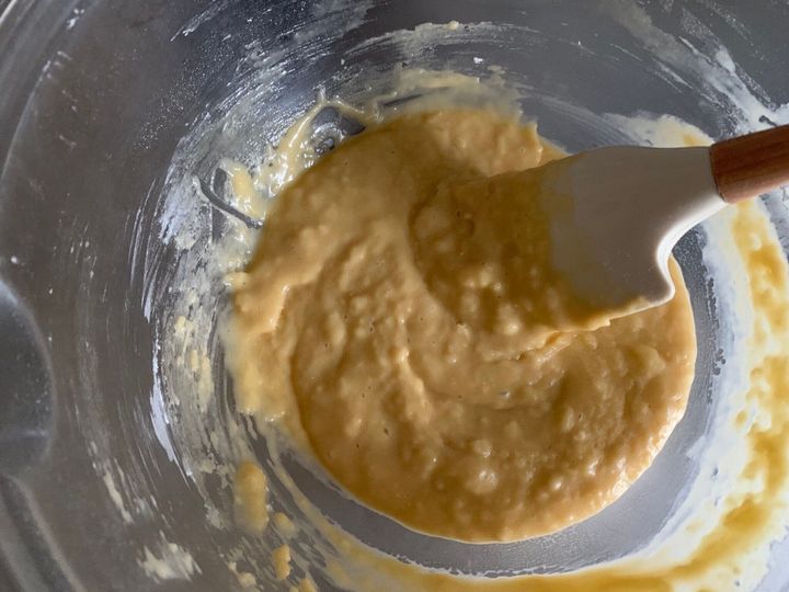 5. 薄力粉とベーキングパウダーを合わせて振るい入れ、ゴムベラでさっくり混ぜ合わせる