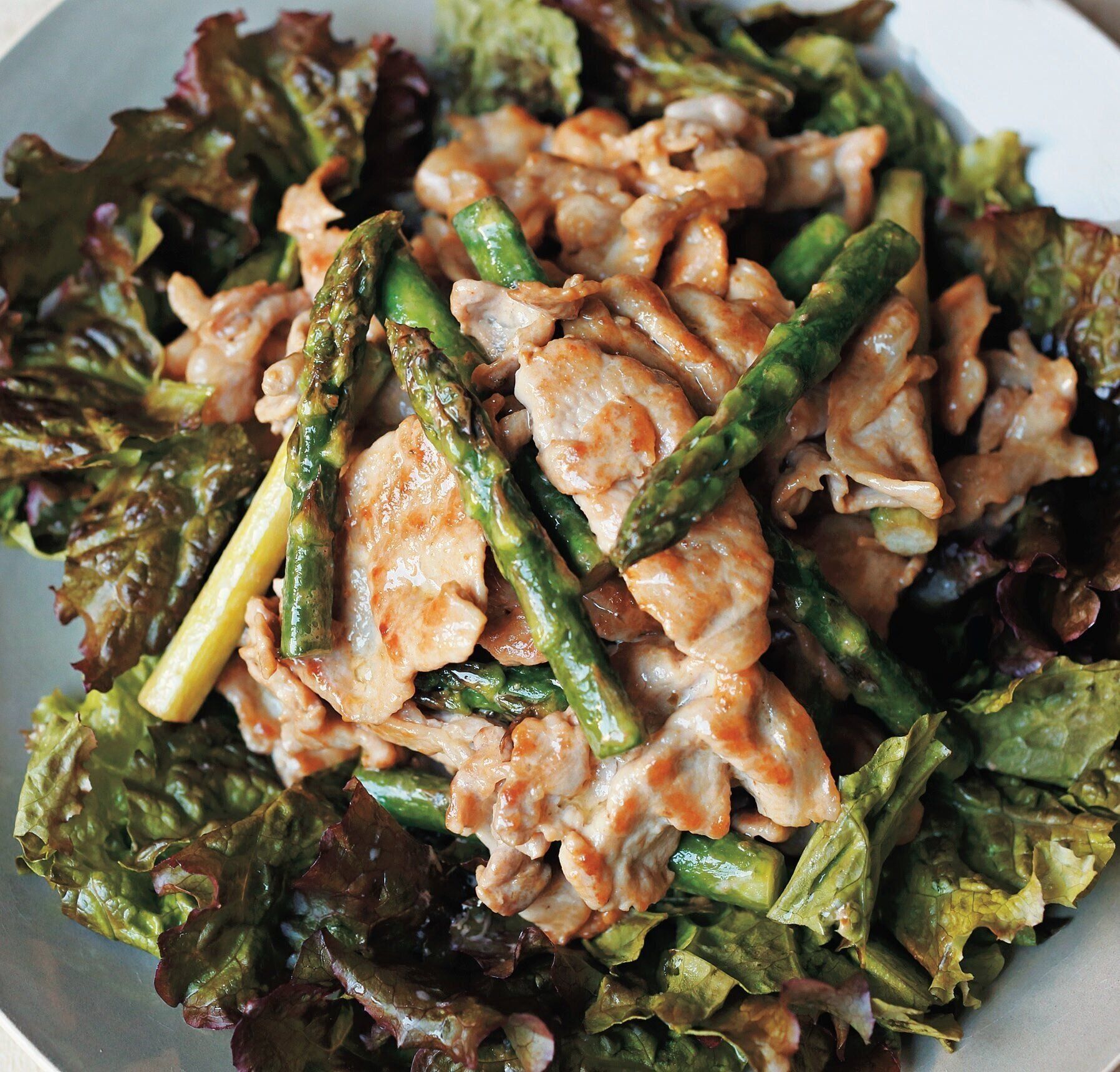 [A]を混ぜ合わせる。フライパンにサラダ油を中火で熱し、豚肉を炒める。こんがりとした焼き色がついたら、アスパラガスを加えてさっと炒める。