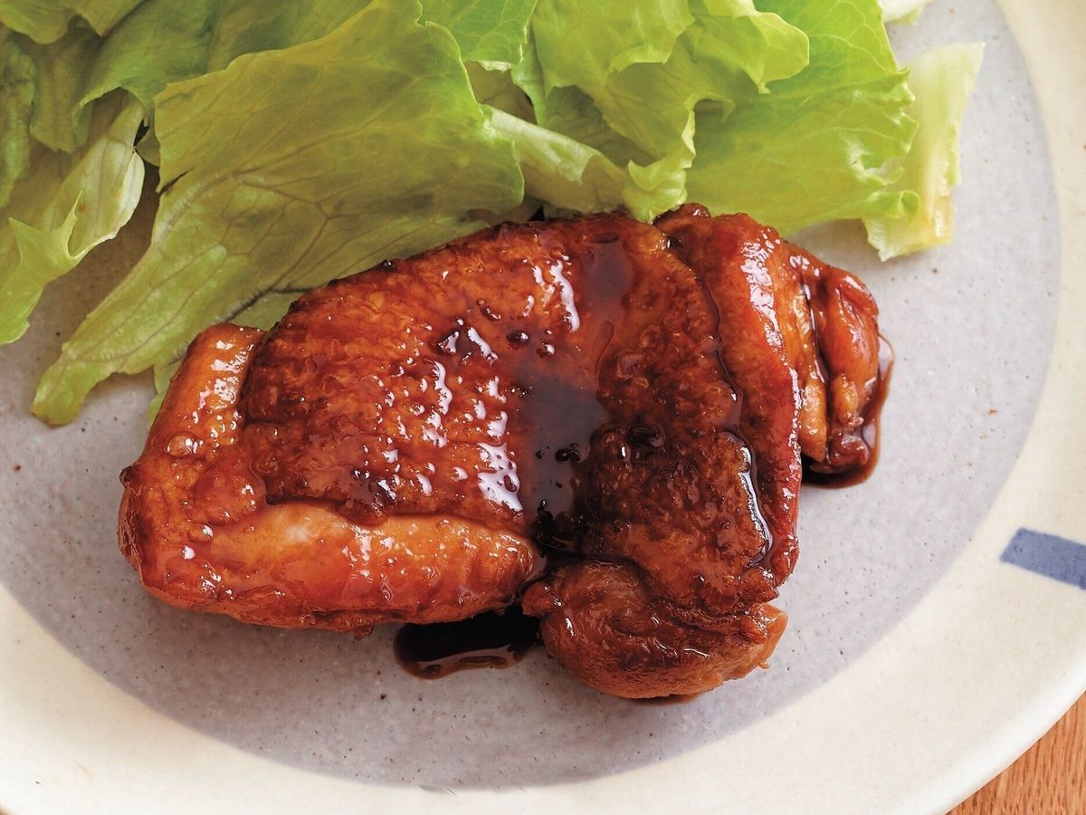 ペーパータオルでフライパンの脂を拭き取る。[A]を加えて、鶏肉を裏返しながら、照りが出るまで煮からめる。器に盛り、レタスを添える。