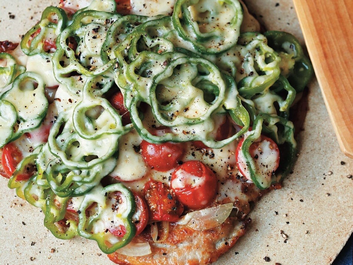 (1)のフライパンを中火にかけて豚肉を焼き、こんがりとした焼き色がついたら裏返す。玉ねぎ、ミニトマト、ピーマンをのせて塩をふり、チーズをのせて、ふたをしてチーズが溶けるまで焼く。器に盛り、黒こしょうをふる。