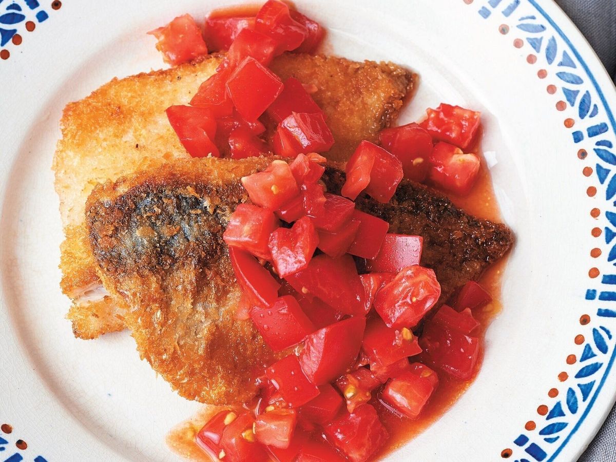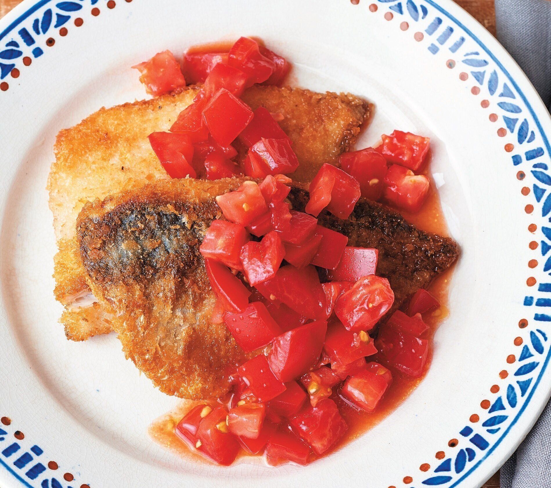 フライパンにオリーブ油大2を中火で熱し、(1)を入れて両面をこんがり揚げ焼きにして器に盛る。トマトに[A]を加えて混ぜ、あじにかける。