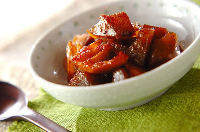 こんにゃくのプリプリ食感と、レンコンのシャキシャキ食感のハーモニーが楽しい、炒め煮のレシピ。甘辛い味つけで、ご飯が進む一品です。お酒のおつまみとしてもよさそうですね。