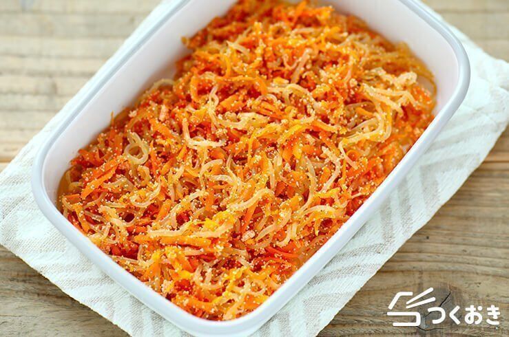 鮮やかな彩りと、コクのある味つけが食欲をそそる、明太バターしらたきのレシピ。明太子・にんじん・しらたきの食感の違いも楽しい一品です。冷めてもおいしいので、常備菜やお弁当のおかずにもおすすめ。