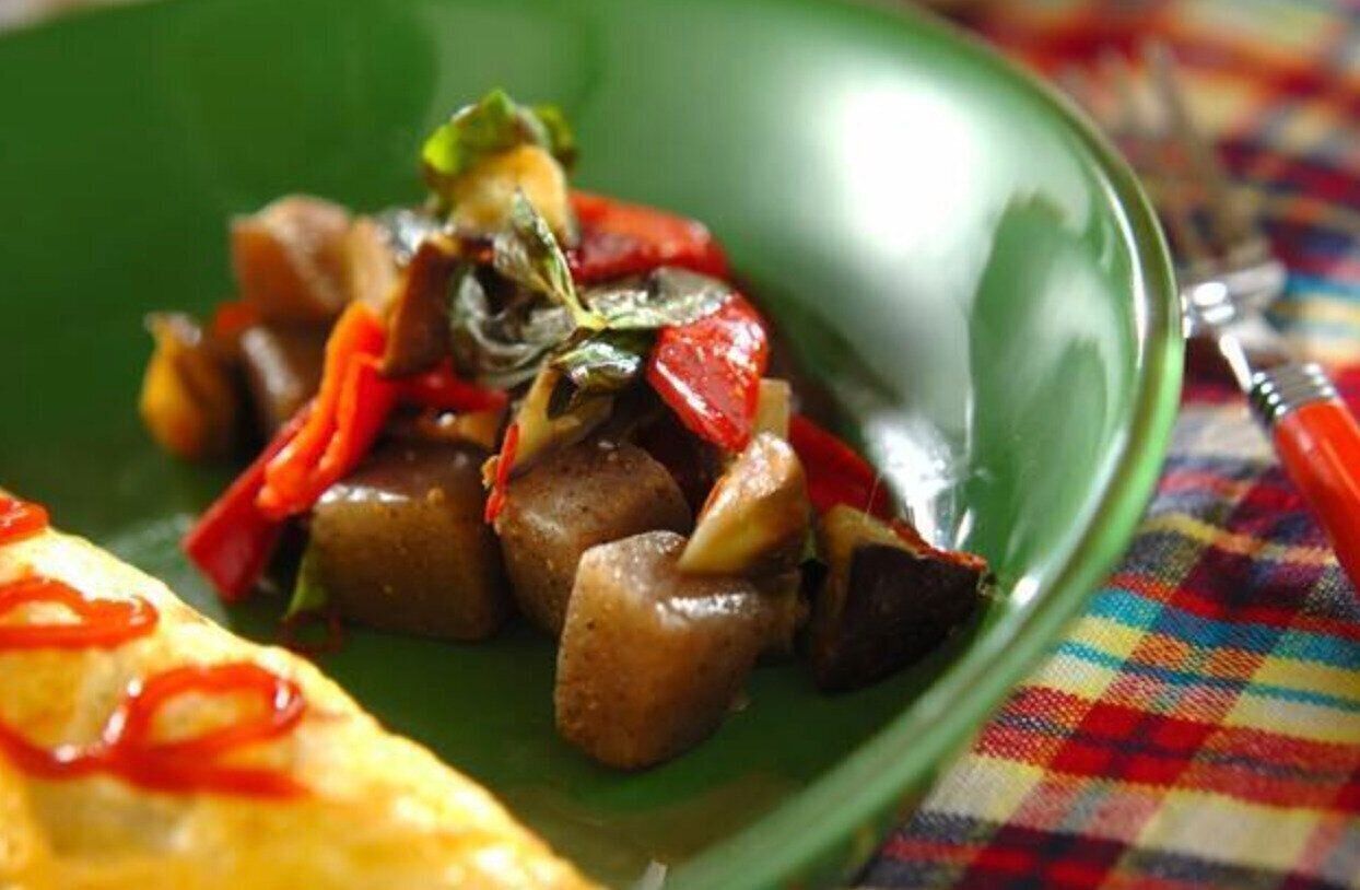 こんにゃくは和食で使われるイメージが強い食材ですが、バジルやアンチョビを使った洋風な一品にもぴったりです。板こんにゃくに切れ込みを入れて調理することで、アンチョビの旨味がしっかりとからみおいしさがアップします。