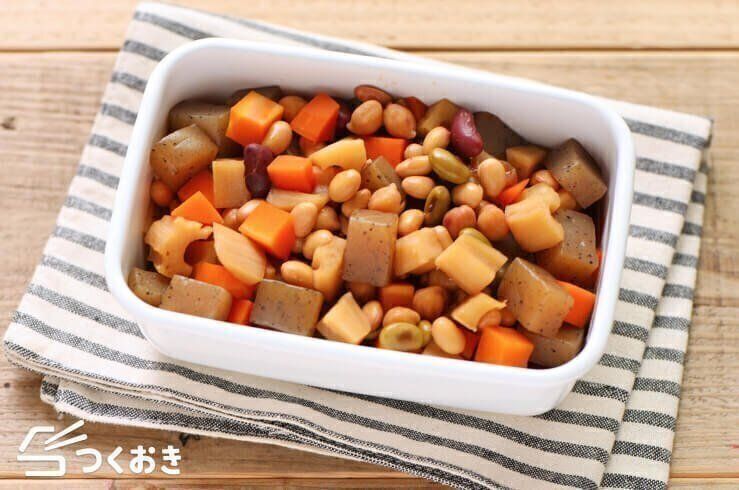根菜・ミックスビーンズ・こんにゃくがバランスよく入った煮物のレシピ。具材を同じくらいの大きさにそろえて切ることで、見た目と食感がアップ!冷めてもおいしく食べられるので、お弁当のおかずにもぴったりです。