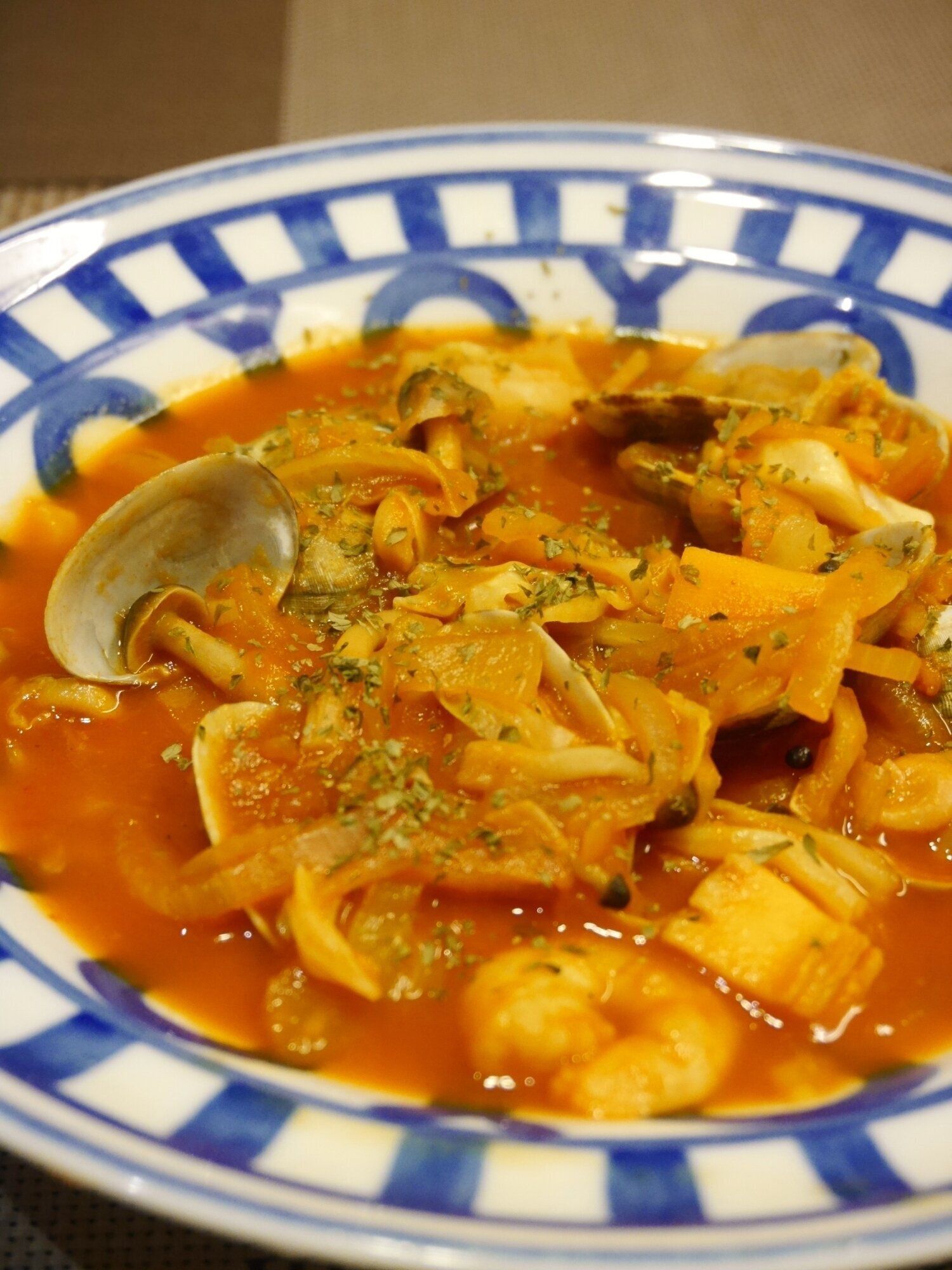 トマトジュース缶で手軽につくれる、あさりのトマトシチュー。殻つきのあさりとシーフードミックスを組み合わせることで、魚介のうま味が際立ちます。ニンニクや鷹の爪で、風味よく仕上げましょう。