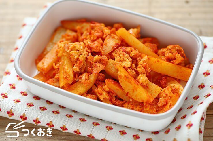 じゃがいもと卵をケチャップで炒めた、子どもウケもいいおかずレシピ。ソースの水分を飛ばしてからからめることで、香りと口当たりがよくなります。じゃがいもを電子レンジで加熱しておくと、より時短でつくれますよ。