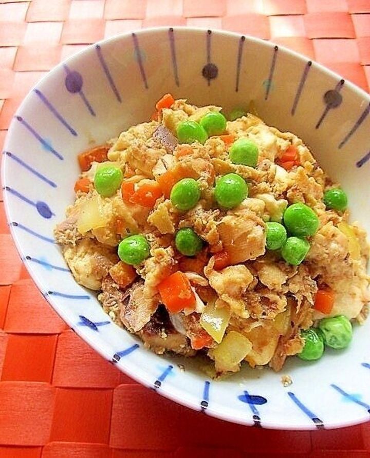 溶き卵やポークランチョンミート、木綿豆腐、モヤシなどを使ったチャンプルのレシピです。仕上げにかつお節をかけて風味をプラス。ほどよいボリューム感もありそうです。和食のメインにいかがでしょうか。