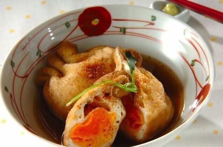 油揚げの中に卵がまるごと入った、卵の巾着煮。ごちそう感のある見た目で、食べ応えもバツグンです。半熟や固ゆでなど、好みの卵の固さになるように煮る時間を調節してくださいね。