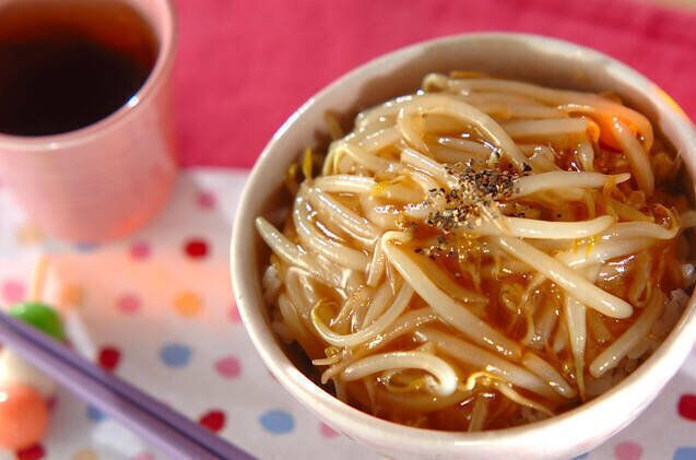 オイスターソースの風味がポイントの、モヤシのあんかけ丼レシピ。約5分で完成するお手軽レシピです。レシピによると、麺や炒り卵の上にのせてもおいしいそう!もやしのみずみずしいおいしさを楽しめそうですね。