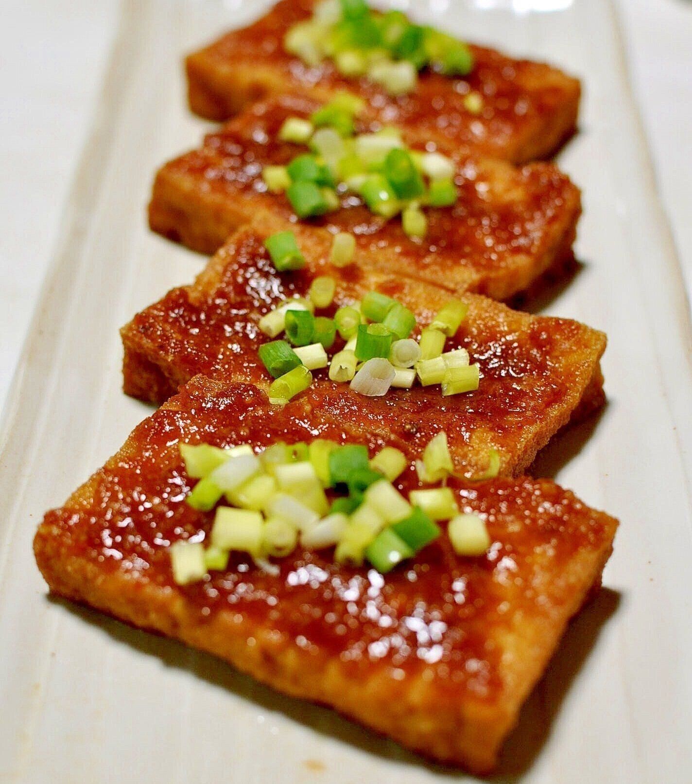 厚揚げに豚バラを巻いて焼き上げれば、ボリューム満点なコクうまおかずが完成します。甘辛いみそだれで、ご飯やお酒が進むこと間違いなし!好みで七味唐辛子を加えると、味がぐっと引き締まります。