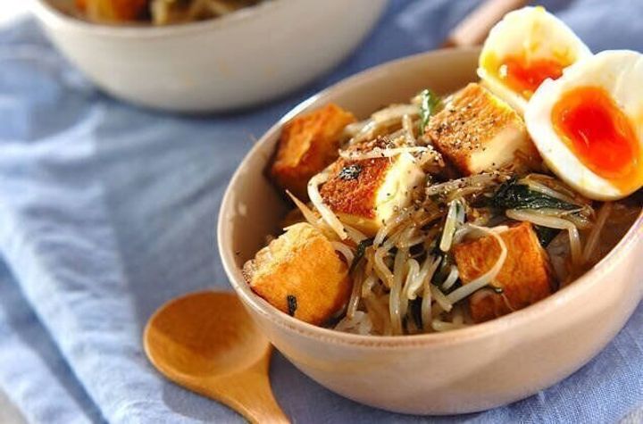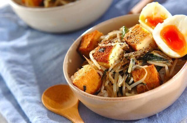 高コスパ食材のもやしと厚揚げをたっぷりのせた、ボリューム満点な丼ものレシピ。大きめな厚揚げで食べ応えバツグンなので、肉なしでもおなかいっぱい満足できますよ。15分で手軽につくれるので、いそがしい日のメニューにもぴったりです。