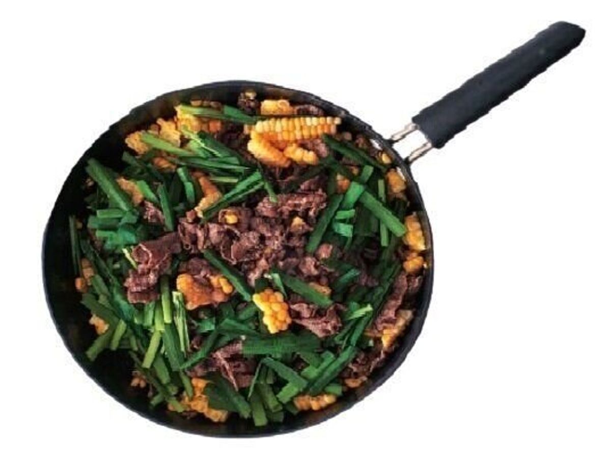 (2)肉の色が変わったら、とうもろこし、にらを加えてさっと混ぜ、しょうゆを回し入れる。香ばしい香りがするまで炒める。
