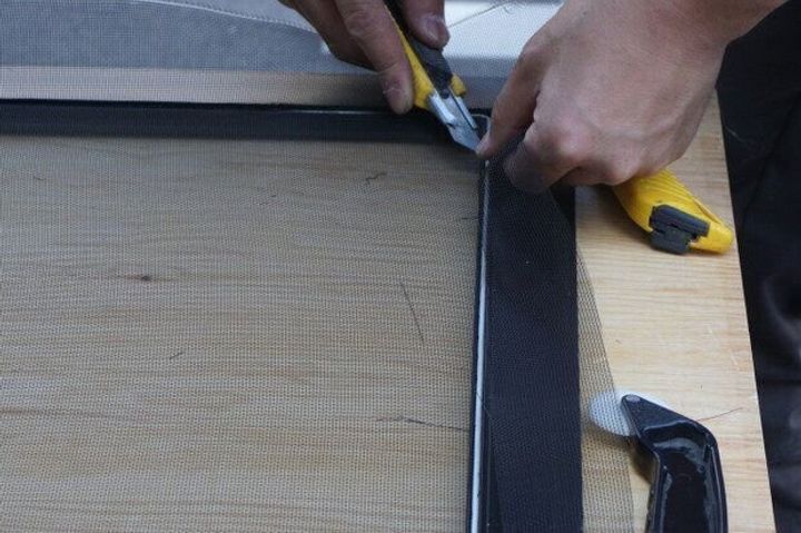 ゴムを一周させたら、網戸の枠からはみ出た網戸シートを丁寧にカットしていきます。このときは枠に沿って、なるべくはみ出た部分を残さないように切りましょう。