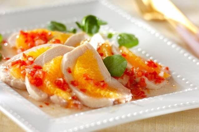 はっさくのおすすめレシピ3:鶏ハムとハッサクのサラダ ラビゴットソース