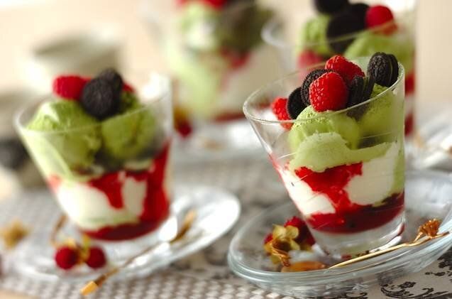 ラズベリーのおすすめレシピ1:ラズベリーと抹茶のパフェ
