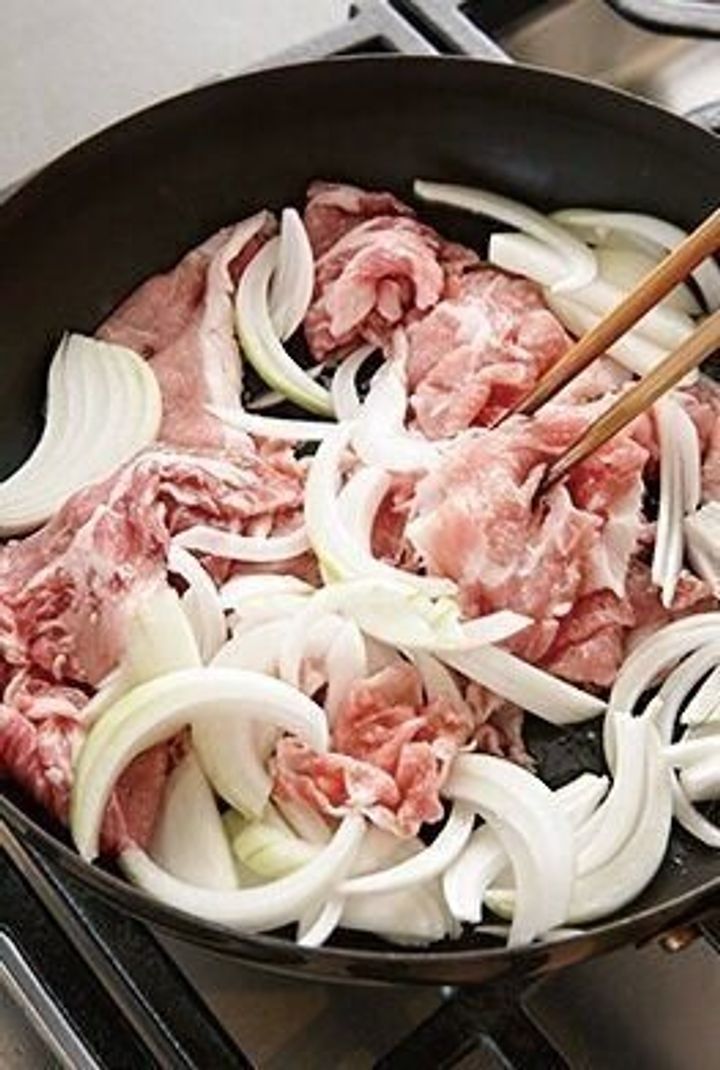 フライパンにサラダ油を中火で熱し、豚肉、玉ねぎを炒める。玉ねぎがしんなりしたら、水400mlを加えて煮立て、しめじを加えて1~2分煮る。