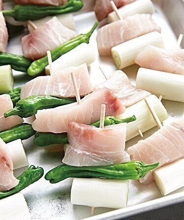 めかじき、しし唐辛子、ねぎの数が違うので刺し方はランダムに。子どもはしし唐辛子抜きにしても。