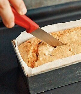 (2)レーズン、くるみを入れて混ぜ、型に入れる。型を少し持ち上げて台にトンと落とし、空気を抜く。180℃のオーブンで40分ほど焼く。焼き始めてから10分のときに手早く取り出し、表面にナイフで切り込みを入れるときれいに焼ける。型から出し、網にのせてさます。