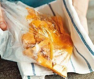 (1)かぼちゃは一口大に切り、さっと水にくぐらせて、耐熱のポリ袋に入れる。袋の口はとじずに電子レンジ(600W)で5分加熱する。袋の上から(熱いのでふきんの上から)もんで、つぶす。[A]を加え、さらにもんで混ぜる。