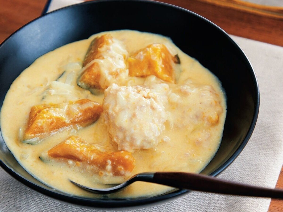 玉ねぎ、かぼちゃ、牛乳を加えて強めの中火にし、煮立ったらふたをして、弱火で10~12分煮る(途中ふたを少しずらす)。塩、こしょうで調味し、混ぜた[C]を溶かし、とろみをつける。