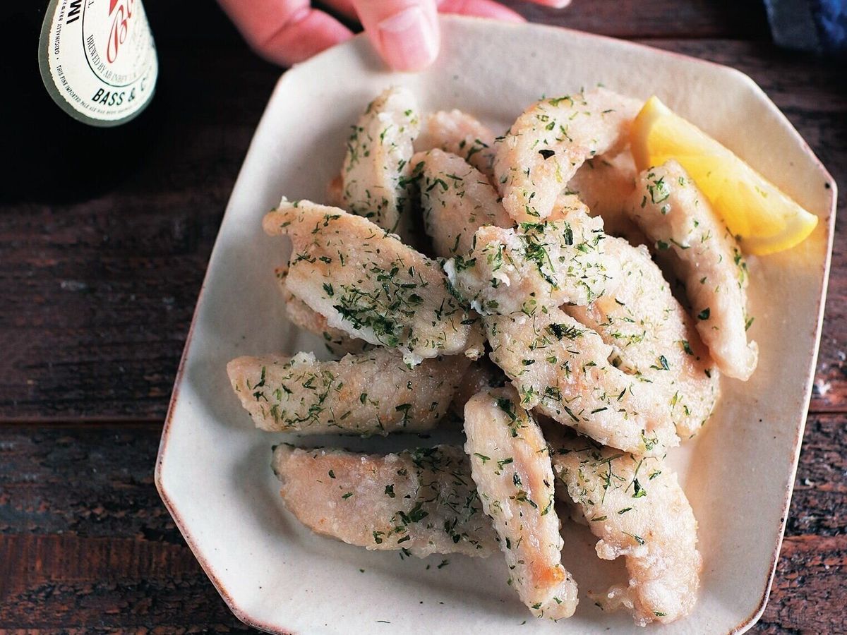 (2)フライパンにサラダ油を中火で熱し、鶏肉を入れてこんがりしたら裏返し、弱火で焼く。バットなどにとり、青のり、塩をまんべんなくふる。器に盛り、好みでレモンを添える。