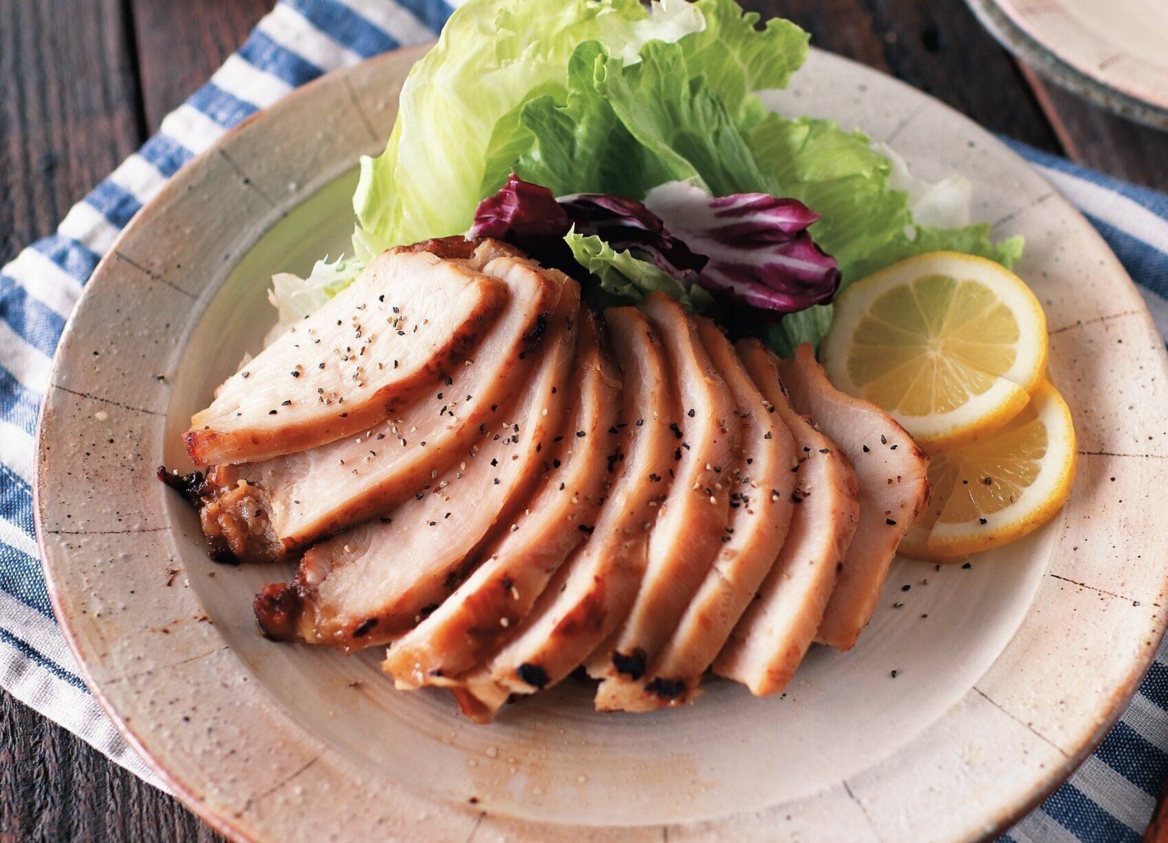 (2)耐熱皿に鶏肉をのせ、ラップを掛けて電子レンジで3~4分、裏返してさらに2~3分、火がとおるまで加熱する。そのまま置いて余熱で火を通し、粗熱を取る(冷蔵室に2時間ほど入れておくと、より味がなじむ)。食べやすい大きさに切って皿に盛り、好みでレタス、レモンを添え、黒こしょうをふる。