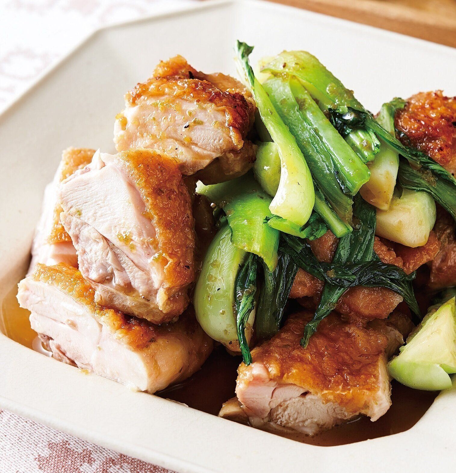 裏返して弱火にし、フライパンの空いている所に青梗菜を入れて約8分焼き、中まで火を通す。[A]は混ぜておく。中火に戻して[A]を加え、煮立たせながらからめる。鶏肉を食べやすい大きさに切って青梗菜とともに器に盛り、汁をかける。