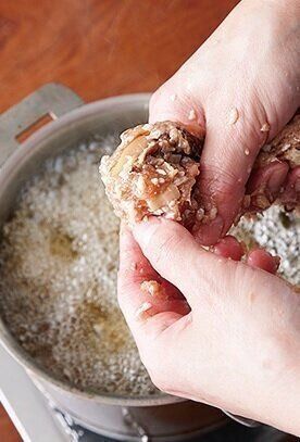揚げ油を中温(170℃)に熱し、(2)を手でつまんでちぎりながら油に入れる(直径2~3cmのだんごのたね2個分をいちどにつまんで2つに分けるとよい)。軽く色づいたら、油の温度を高温(180℃)に上げ、きつね色になるまで揚げる。
