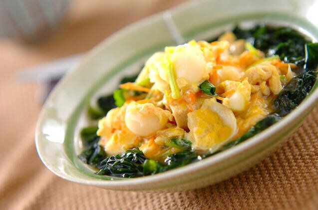たっぷりの小松菜と高野豆腐を煮込んだ、素朴な一皿。白だしベースの優しい味わいが特徴です。高野豆腐を小さめの角切りにすると、食べやすくお弁当にも入れやすいですよ。
