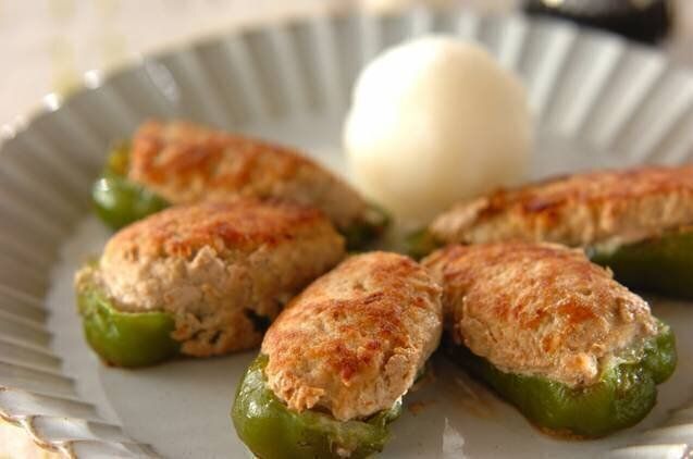 高野豆腐を混ぜ合わせた、ピーマンの肉詰めレシピです。蒸し焼きにすることでジューシーな肉汁がしみ出て、ピーマンのほどよい苦味とマッチします。大根おろしをつけて食べるのがおすすめです。