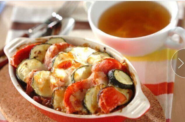 夏野菜グラタンとコンソメスープ